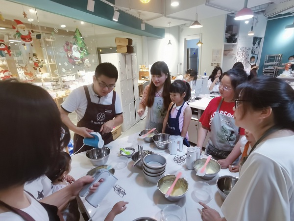 打发鸡蛋、搅和面粉……在烘焙师的耐心指导下,家长和孩子们相互协作,完成了蛋糕坯的制作,瞬间室内处处散发甜美的蛋糕香味,一张张笑脸洋溢着喜悦和欢乐。