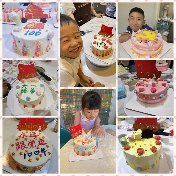 随后,孩子们拿起五颜六色的奶油袋,涂抹奶油、摆放水果、添加装饰,每个步骤都一丝不苟,并且充分发挥着想象力,一个个以建党百年为主题的创意蛋糕新鲜出炉。公司员工与孩子们共同展现了一种情怀,一种叫做“我爱我的祖国”的浓厚情怀。孩子们用自己的童心巧思、稚嫩笔触表达着热爱祖国、为党庆生的深情。