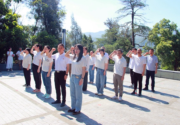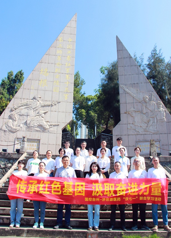 在中国工农红军第十三军二师烈士陵园,面对高耸的纪念碑,大家怀着崇敬的心情在烈士碑前肃立默哀。随后,国控台州党支部书记林琳和浙江济世源医药公司党支部书记陈才铭带领全体党员重温入党誓词。