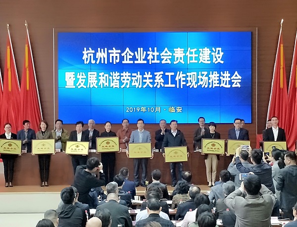 10月28日,杭州市企业社会责任建设暨发展和谐劳动关系工作现场推进会在临安区玲珑工业区召开,国药控股浙江有限公司在会上被授予“浙江省创建和谐劳动关系暨双爱活动先进企业”称号,公司工会主席邵安利上台接受了杭州市人大常委会副主任、市总工会主席郑荣胜等领导共同颁发的荣誉牌匾。