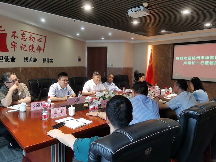 2022年6月22日,杭州市市场监督管理局卢建祥副局长一行莅临国药控股浙江有限公司,并邀请4家药品经营企业浙江九州通医药有限公司、浙江上药新欣医药有限公司、浙江众成医药有限公司、浙江省医疗健康集团医药有限公司一同调研了解目前疫情当前经营环境下企业存在的经营困难和市场监管过程中碰到的问题。药品流通监督管理处处长王强、药品流通监督管理处一级主任科员唐青萍、医疗器械监督管理处一级主任科员董华胜陪同调研。