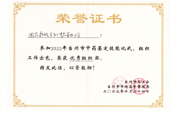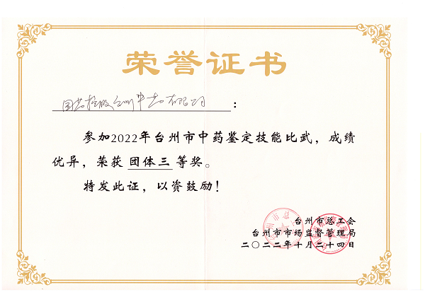在2022年台州市中药鉴定技能竞赛上,国药控股台州中药有限公司精心组织,挑选林鑫、林海斌和繆璐茜三人组队代表公司参赛,参赛人员在比赛期间沉着冷静,顶住了压力,取得了优异成绩。公司荣获本次比赛团体三等奖和优秀组织奖。同时林海斌同志获得“台州市十佳中药鉴定能手”称号。