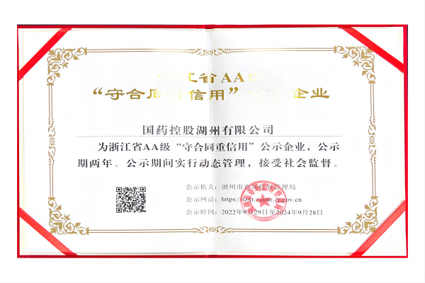 国药控股湖州有限公司荣获湖州市市场监督管理局颁发的“2022年浙江省AA级‘守合同重信用’公示企业”。